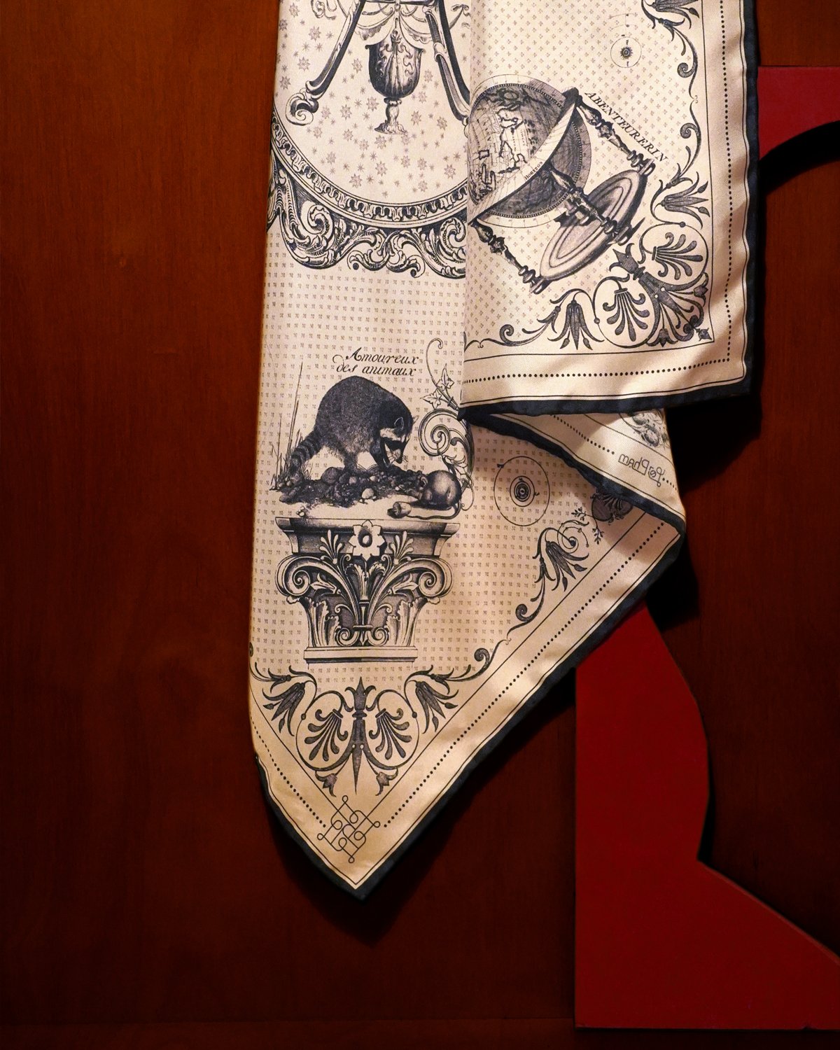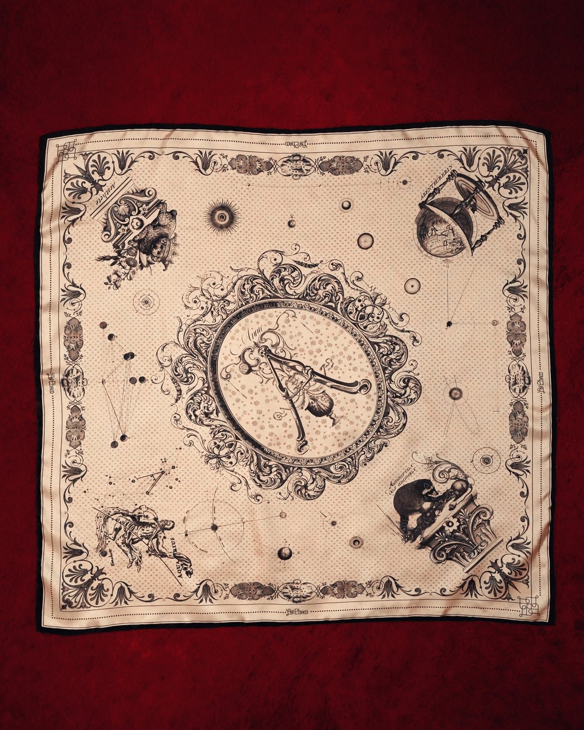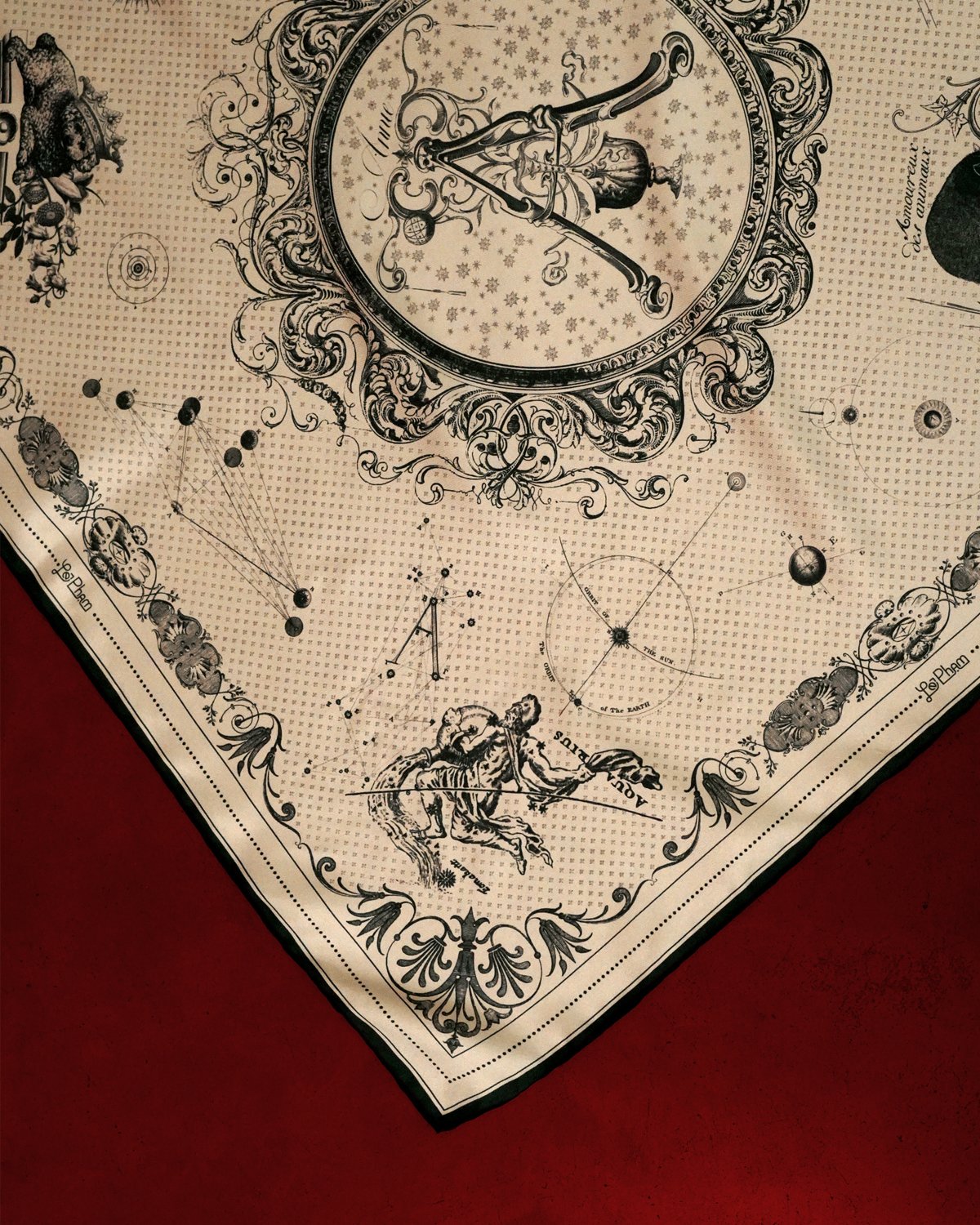 In the Ascendant is an original textile artwork created for a special birthday celebration. Four illustrated corners trace the recipient’s love of beauty, adventure, animals and their Aquarian nature – woven into a unified wearable composition meant to travel with the wearer.